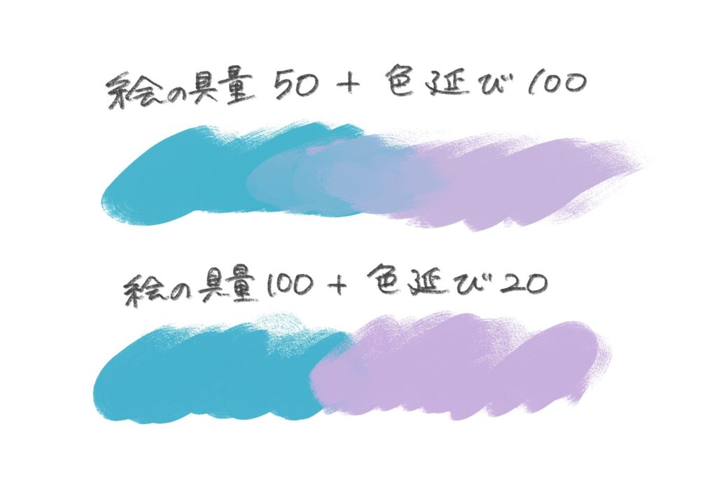 なめらかに色をなじませたい場合は、絵の具量を「少なめ」に・色延びを「大きめ」に設定します。