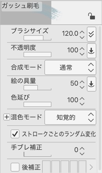 基本的には初期設定のままで、「絵の具量」と「色延び」だけ描くときに調整することが多いよ!